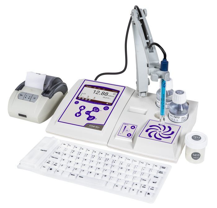 COND 80+ kit with BASIC conductivity cell Glass-Pt VPT80/1, 1413 μS, 12.88 mS conductivity standards, cell holder, soft keyboard, power supply and accessories. Without mixer.