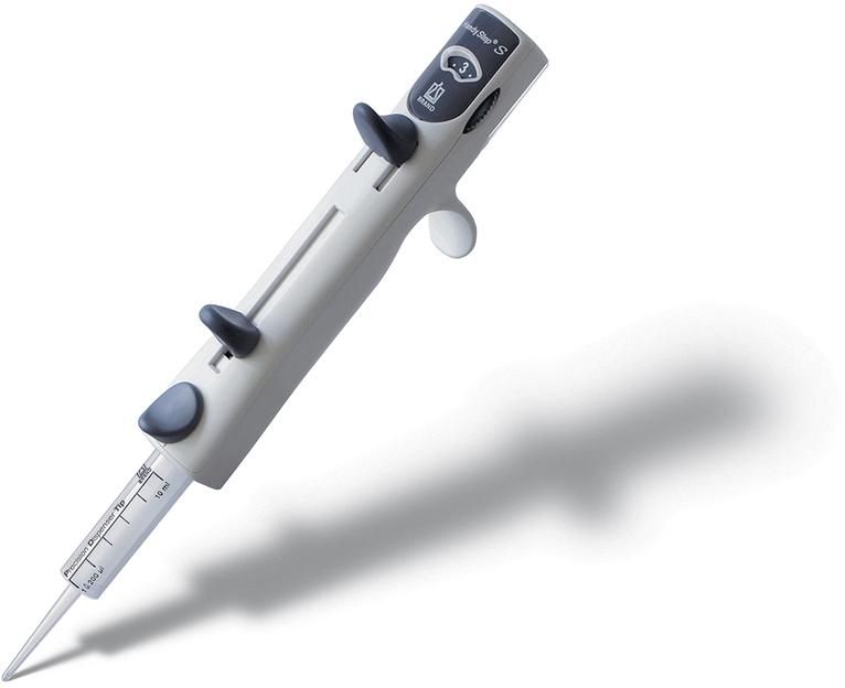 A truly versatile mechanical serial feeder. Together with the PD-Tip™ syringes, which are available in ten sizes, nearly sixty different dosing volumes can be set. Thanks to its thin design, it provides easy, comfortable, one-handed use. Thanks to its ergonomic design, used syringes can be thrown away without touching them. In addition to the PD-Tip™ syringe stone, syringes from other manufacturers can also be used for the HandyStep S series dispenser.