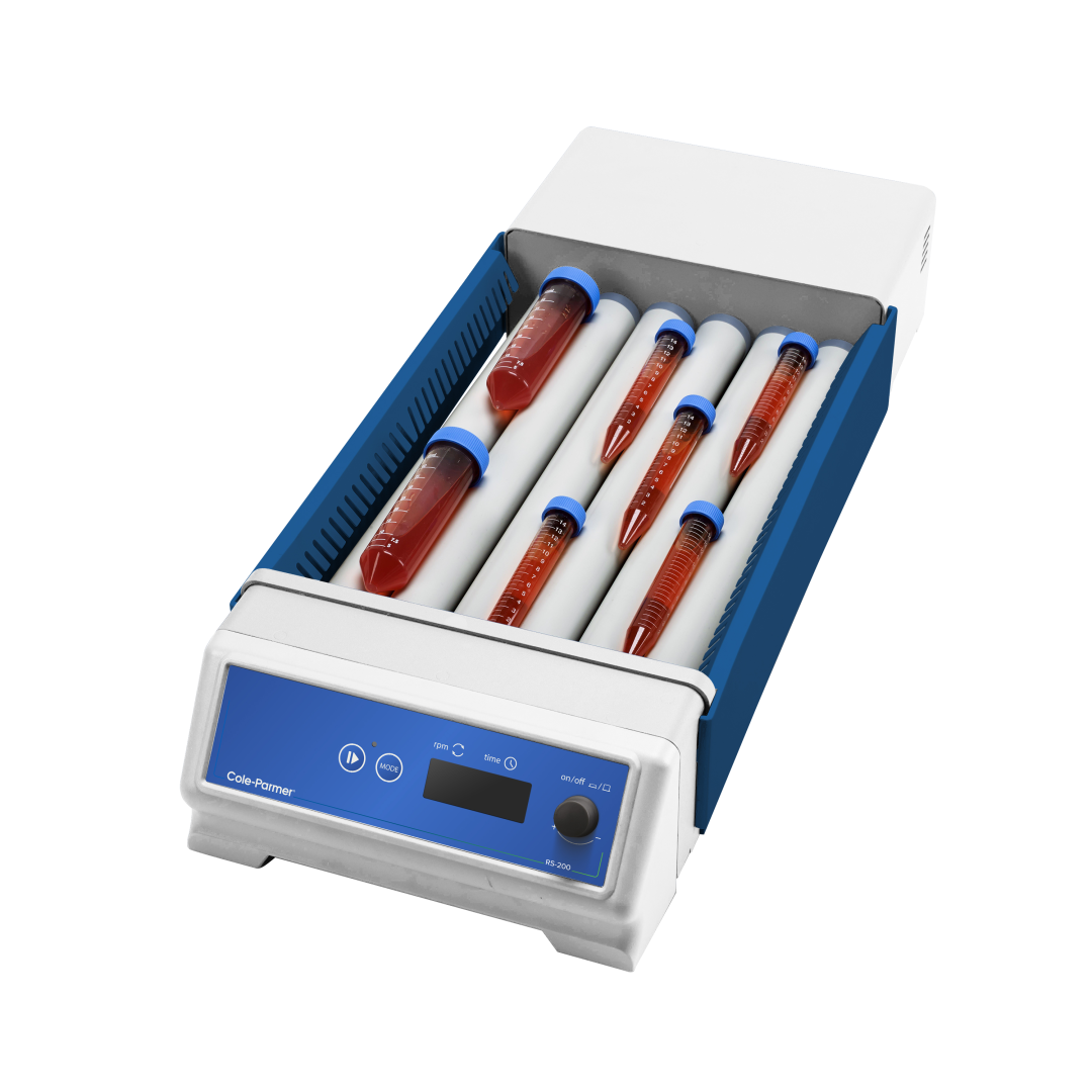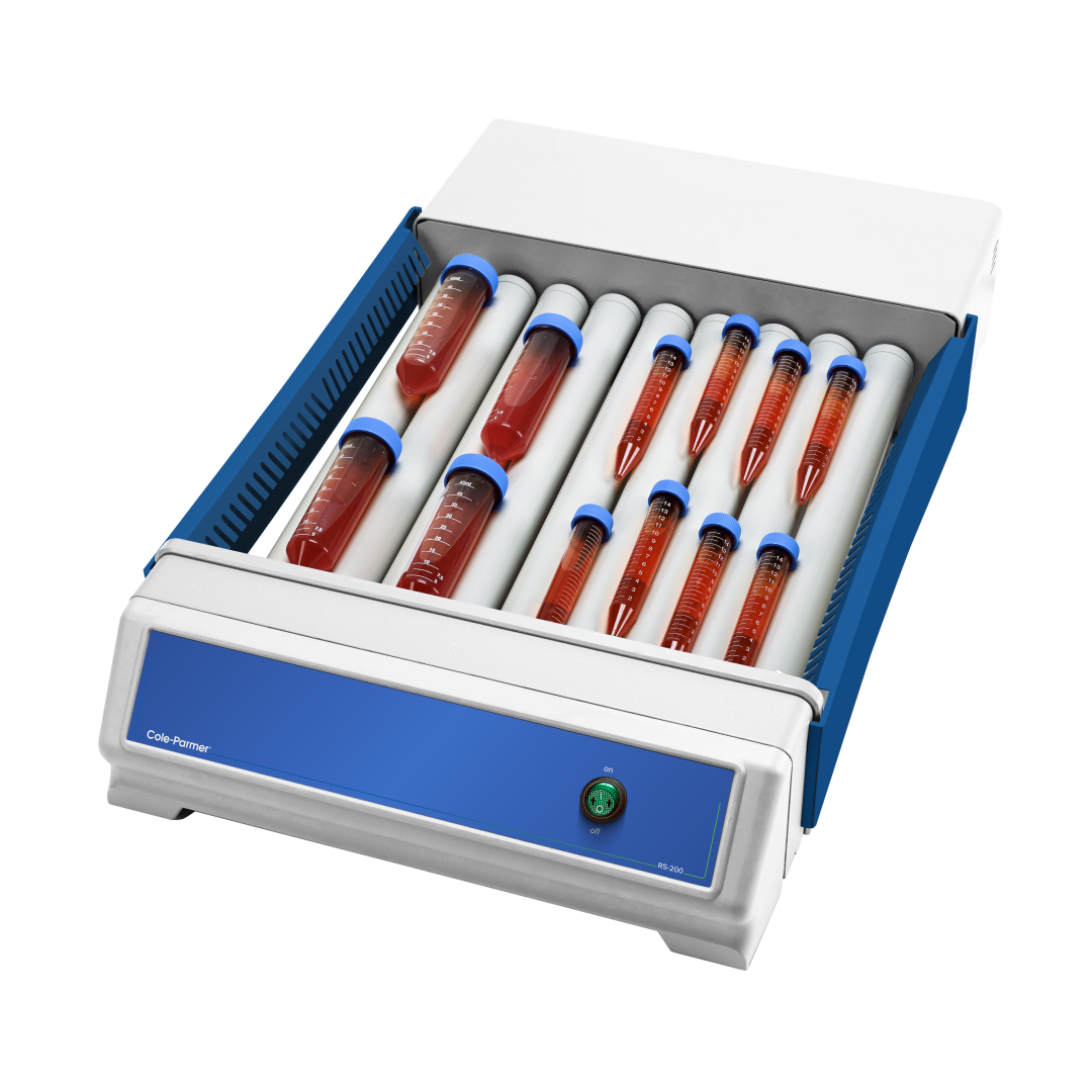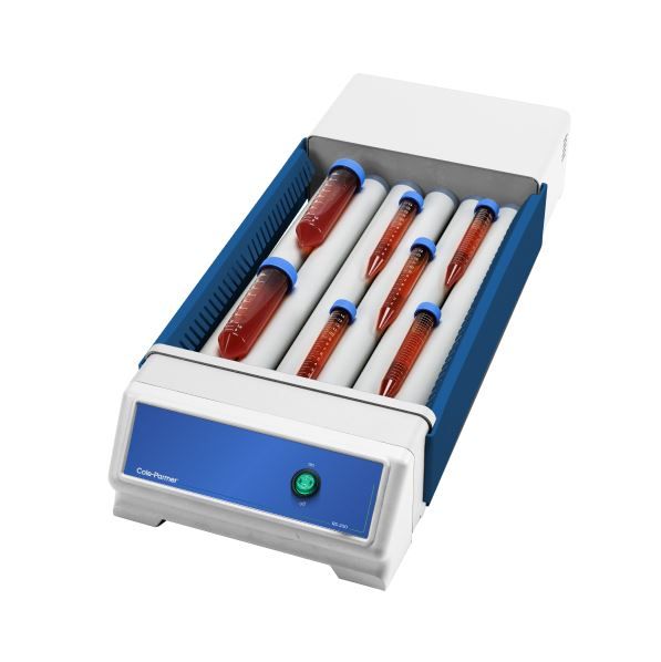 Devices suitable for gentle but thorough mixing of viscous substances, blood samples and liquid-solid suspensions in test tubes. The liquids are mixed in two directions: the test tubes and centrifuge tubes placed on 6 or 9 rollers are rotated, and on the other hand, they are also rocked up and down. The drip tray placed under the rollers collects accidentally spilled and dripping materials.