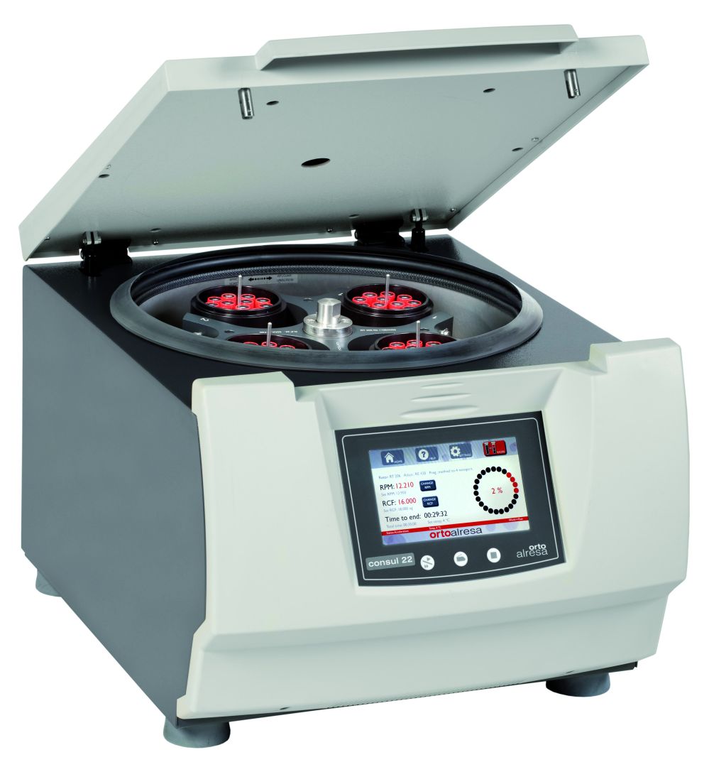 Similar to the floor standing Magnus 22 centrifuge, the Orto Alresa Consul 22 has a touch-screen controller, which provides the possibility of password protection in addition to easy settings and monitoring of the parameters.