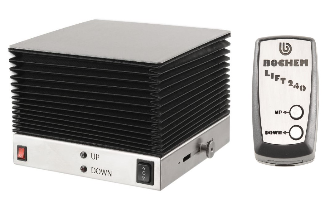 Electrical lift LIFT 240 First electrical lab jack of compact design! More and more lab activities are performed in the hood. However, space conditions are often quite restricted there. This is the reason why the new electrical “Lift 240“ comes with motor and control system integrated in the lab jack. Ensuring an absolutely stable stand and wobble-free lifting and lowering, it offers perfect safety. The extremely robust, highly precise scissor technology of 18/10 steel and the electronic components are durably protected using a bellows of chemically resistant PTFE. And since every hood is only really safe, if it remains closed, the lab jack is operated by a remote control! The design of the electrical “Lift 240“ is identical with that of the mechanical 240 x 240 mm BOCHEM lab jack. Both variants can be used and replaced, as desired, in existing structures. An end stop can be manually adjusted at the outside. Properties: Dimensions, retracted (LxWxH): 240 x 240 x 120 mm Max. height: 300 mm Workspace (LxW): 240 x 240 mm Weight: 6 kg Lifting speed: 180 mm/min Max. lifting of scissor: 180 mm Max. load capacity (dynamic): 25 kg Nominal torque: 8 Nm Degree of protection: IP 30 Supply voltage transformer: 100-240 VAC, 50/60 Hz Output: 24 V Battery remote control: 3 V, Lithiumzelle CR2430 Permissible ambient temperature: 5 - 45°C Noise emission: < 80 dB (A) Material work space: 18/10 Stahl Material body: 18/10 Stahl Material corrugated bellows: PUR