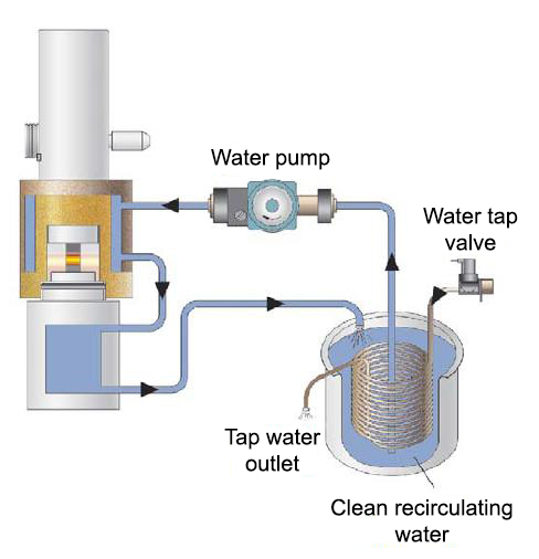 Due to the high operating temperature, the furnace must be cooled after the measurement. This is done by a heat exchanger unit - separate from the analyzer. The heat exchanger prevents limescale in the tap water from entering the furnace. The advantages of the separate arrangement: the analyzer can be much smaller in size and weight thanks to the heat exchanger placed outside it.