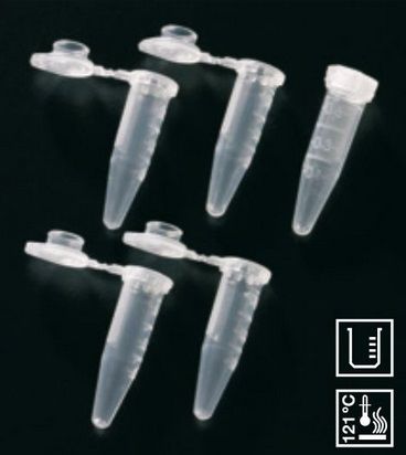 Made of ultra clear polypropylene. Tubes have a frosted writing surface on side and on closure for better sample identification. Caps are easy to handle and can be opened and closed with one hand. Lids are easily pierceable. Tubes have moulded-in graduations in 100 ul increments from 0.1 to 0.6 ml. Withstand centrifugation up to 17,000 xg. Dimensions: 30x8 mm. Can be used from -80°C to 121°C - Autoclavable. RNAse, DNAse and PCR inhibitors free. Made from special resins to minimise liquid retention and ensure optimum sample yield, thus eliminating the use of lubricants that may be harmful to samples. The proprietary formulation is completely non-reactive. With a low adhesion surface, is specially designed for research procedures such as protein work and nucleic acid amplifications.
