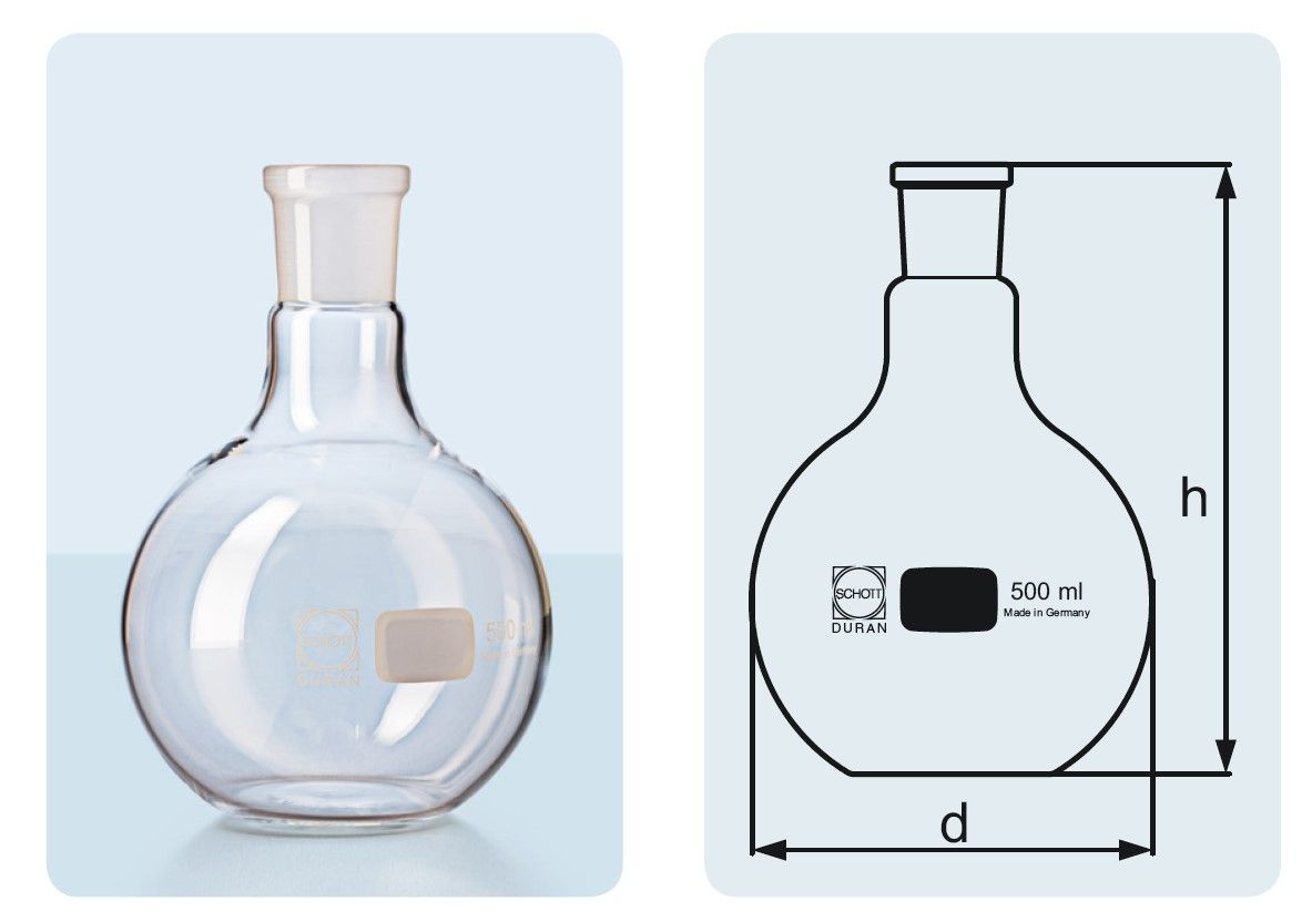 It can be orderedin several volumes and with different size of joints. Made of heat-resistant borosilicate 3.3 glass, Duran brand.