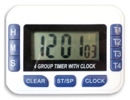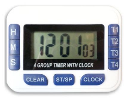 This digital timer has four independent timer and clock functions and a large LCD display.