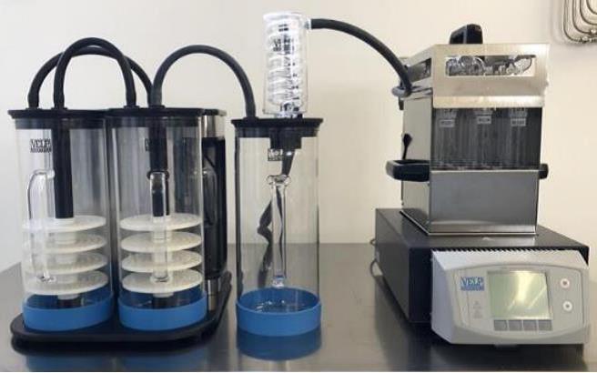The optional kit for water samples (code: A00000477) consists of a 3.5 liter container with a condenser that allows the evaporated liquid to condense and collect without any intervention during the analysis.