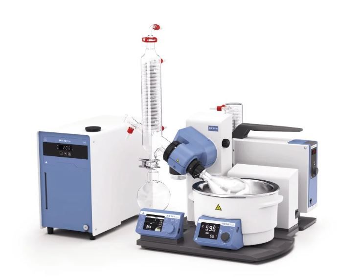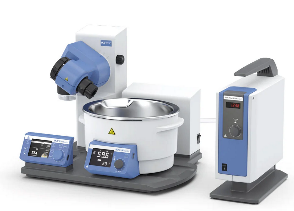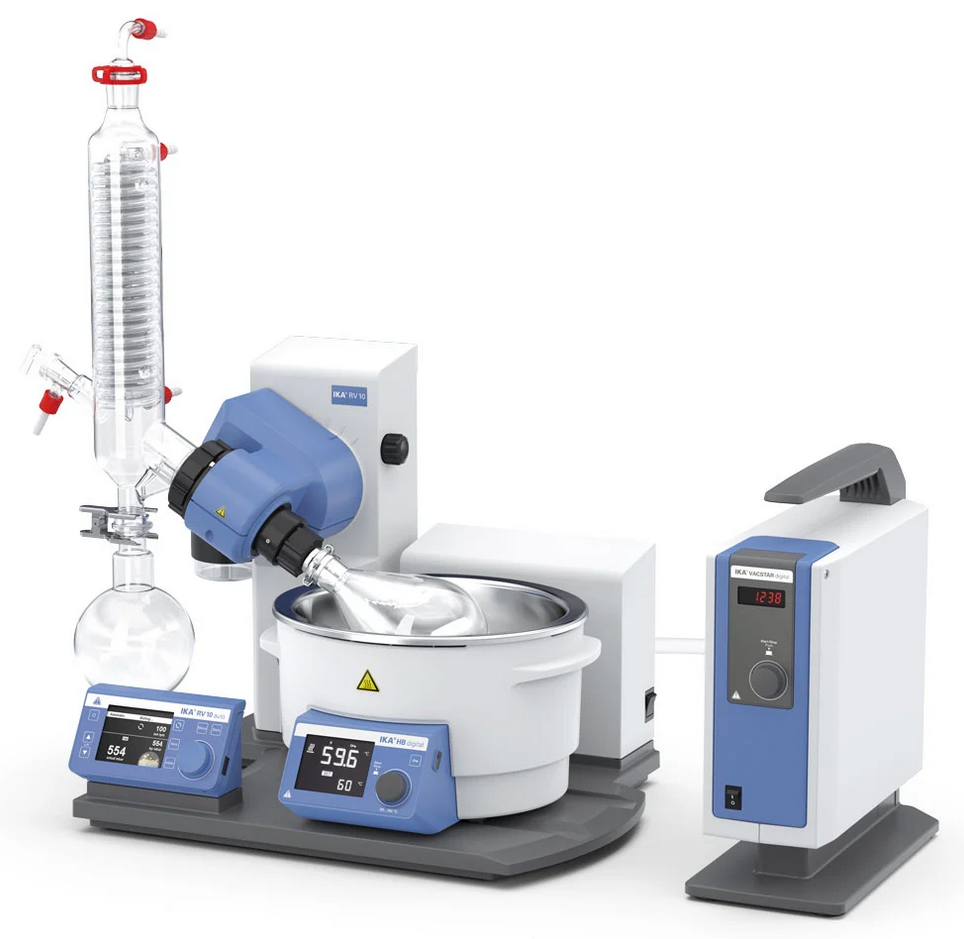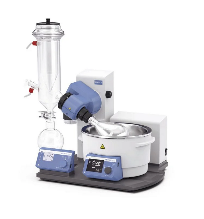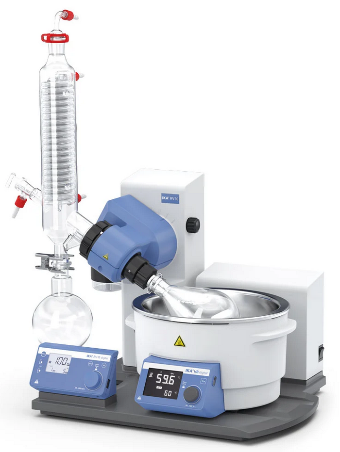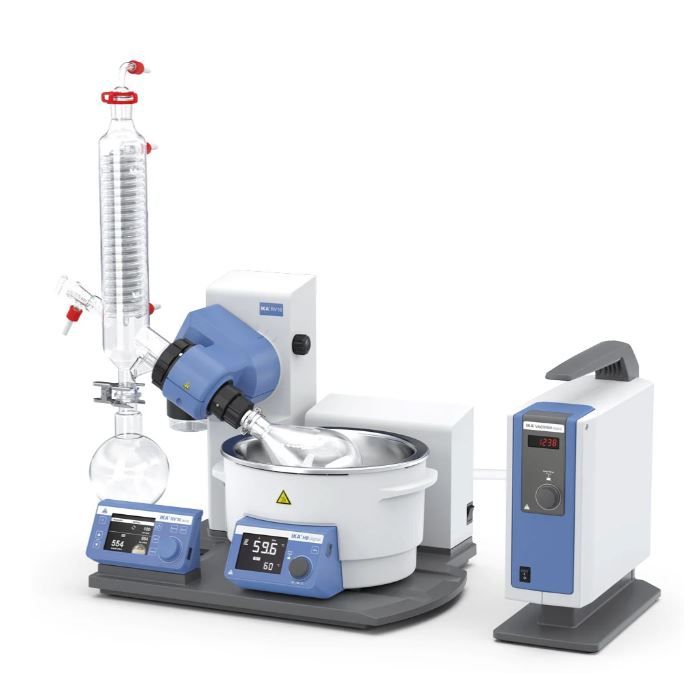 Vákuum vezérléssel. Digitális fordulatszám és hőmérséklet kijelzés, kontrolleres vezérlés, motoros liftmozgatás. Függőleges elrendezésű vízhűtéses üvegfeltéttel magasabb forráspontú oldószer desztillálásához és kisebb helyigényhez.