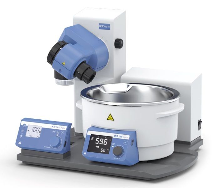Digitális fordulatszám és hőmérséklet kijelzés. Kontrolleres vezérlés, manuális liftmozgatás, biztonsági kiemelő mechanizmussal. Függőleges elrendezésű üvegfeltéttel. Lombik csatlakozó mechanizmus beépített lekapcsoló funkcióval, a bepárló lombik egyszerű cseréje érdekében. Beállítható bemerülési szög. Kompatibilis az IKA RV 10 üvegeszközeivel.