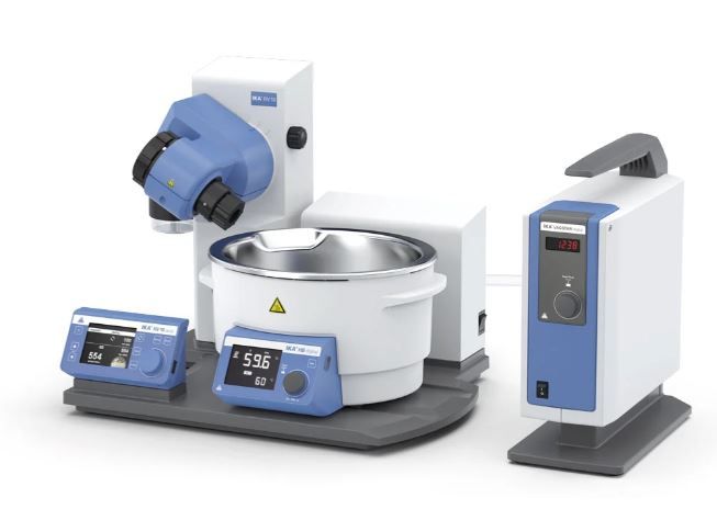 with water bath, vacuum control, vacuum, recirculating chiller, vertical glassware
