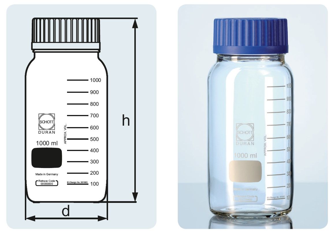 The bottle made of heat-resistant borosilicate 3.3 glass. The blue screw cap and the pouring rim are made of polypropylene. Autoclavable. If required, we also provide a solid screw cap made of fibreglass Teflon.