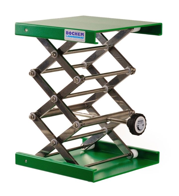 Lab-Jack out of aluminium, EPOXI powder coated, green, DIN 12897, Height 55-120mm, 100x100mm, with adjusting wheel, operating load (Kg max dynamic) according to DIN 12 897