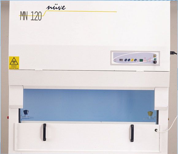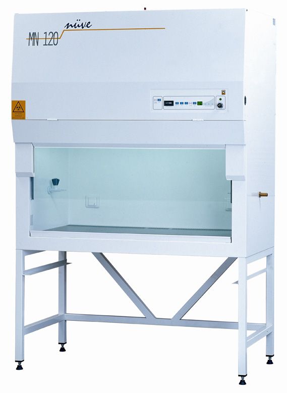 NÜVE's Class II A2 biological safety cabinets are made in two sizes. About 70% of the room air drawn in through front panel is filtered through a HEPA filter and delivered to the work space with laminar flow, the remaining 30% of the air is returned to the laboratory airspace through a second HEPA filter.