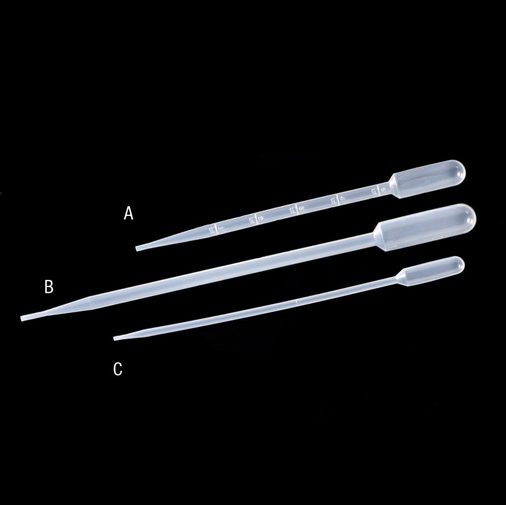 Pipette ''A'' in the picture. Low adhesion surface. Fine tip pipettes, excellent for dispensing micro volumes and small drops. They can be frozen in liquid nitrogen. It has an extended fine tip. Ideal for Kits-Test, for example HIV, pregnancy, serum separation in Paediatrics mainly, chromatography cup filling, microvials, microplates, electrophoresis gels, E.L.I.S.A., etc. Material: LDPE.