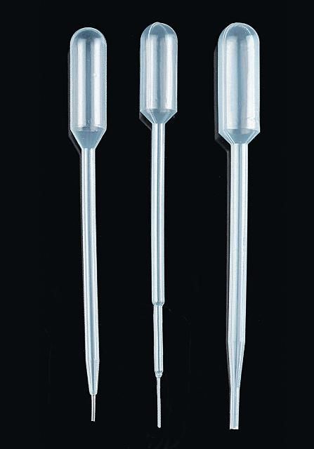 Pipette ''C'' in the picture. Low adhesion surface. Fine tip pipettes, excellent for dispensing micro volumes and small drops. They can be frozen in liquid nitrogen. It has an extended fine tip. Ideal for PCR techniques, E.L.I.S.A., DNA samples, protein assays, hybridoma, atomic absorption, and all types of additions in microtechniques, electrophoresis, etc. Material: LDPE.