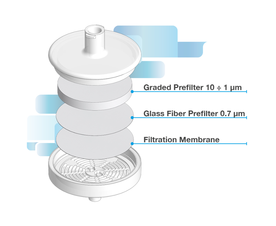 Multi-layer syringe filter with graduated pre-filter for easy preparation of larger and difficult-to-filter samples. The double-layer pre-filter allows for less effort, making filtration faster and easier for lab technicians. Provides high-quality filtration and clean samples every time, even for viscous samples and those requiring the strongest sediment filtration.