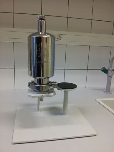 The filtrate can be collected in a container placed on the stand - under the filter unit. If required, a pipe can be connected to the lower outlet of the overpressure filter, and the water / other liquid can be collected in a larger container. The outer diameter of the spout is 12 mm.