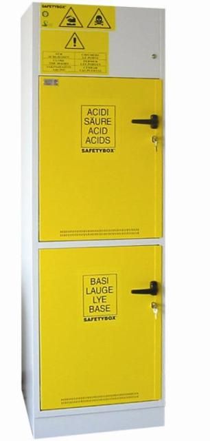 Type 600/50: single-door acid storage cabinet with electric extractor, with 2 8-liter / 50 kg load-bearing painted shelves. A stainless steel shelf is recommended for storing lye.