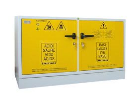 Type AB 1200/50: acid and alkali storage cabinet with separated interior space, electric extractor, 2 stainless steel, 2 painted shelves, each with a capacity of 9 liters / 100 kg.