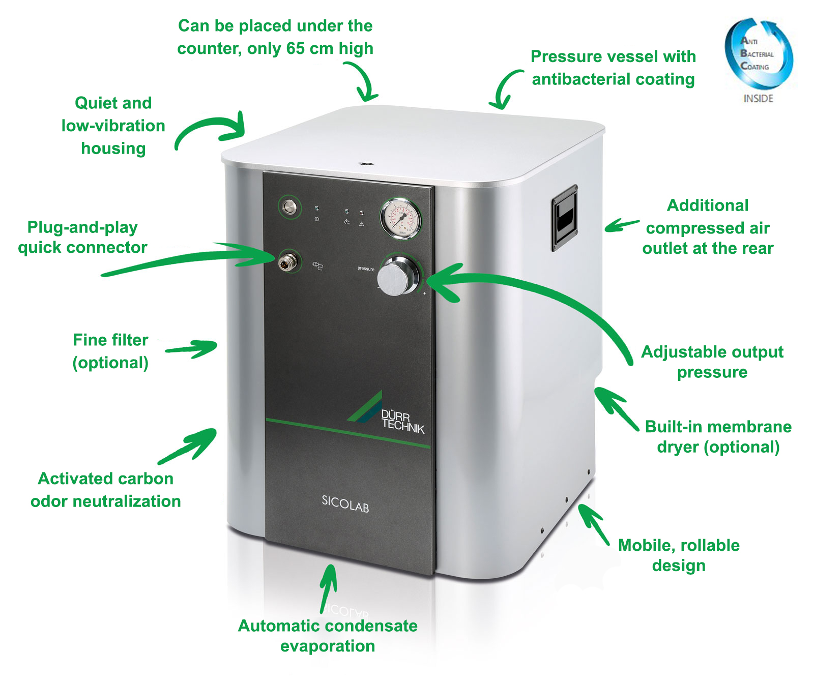 Modern, countertop, ultra-quiet, oil-free, low-vibration central compressor station.
