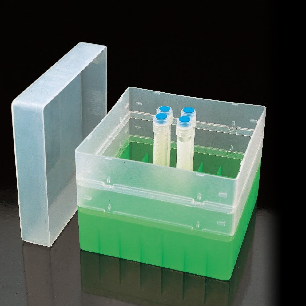 Polypropylene rack. Resist -196°C and autoclavable up to 121°C. Dimensions with lid: 133x133x96 mm. With transparent lid to help identification. Sections will hold 49 tubes up to 16 mm diameter and 93 mm height.