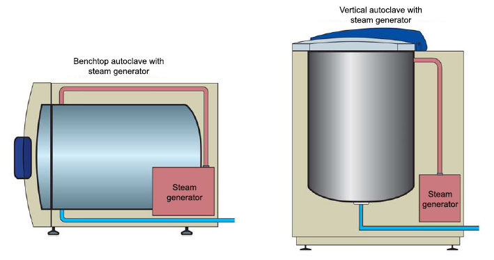 Another (modern) way to produce steam is a steam generator. The steam generator is located separately from the chamber, but usually under the autoclave housing.