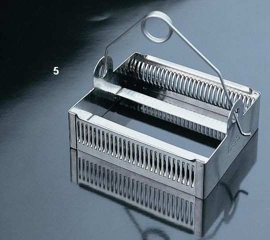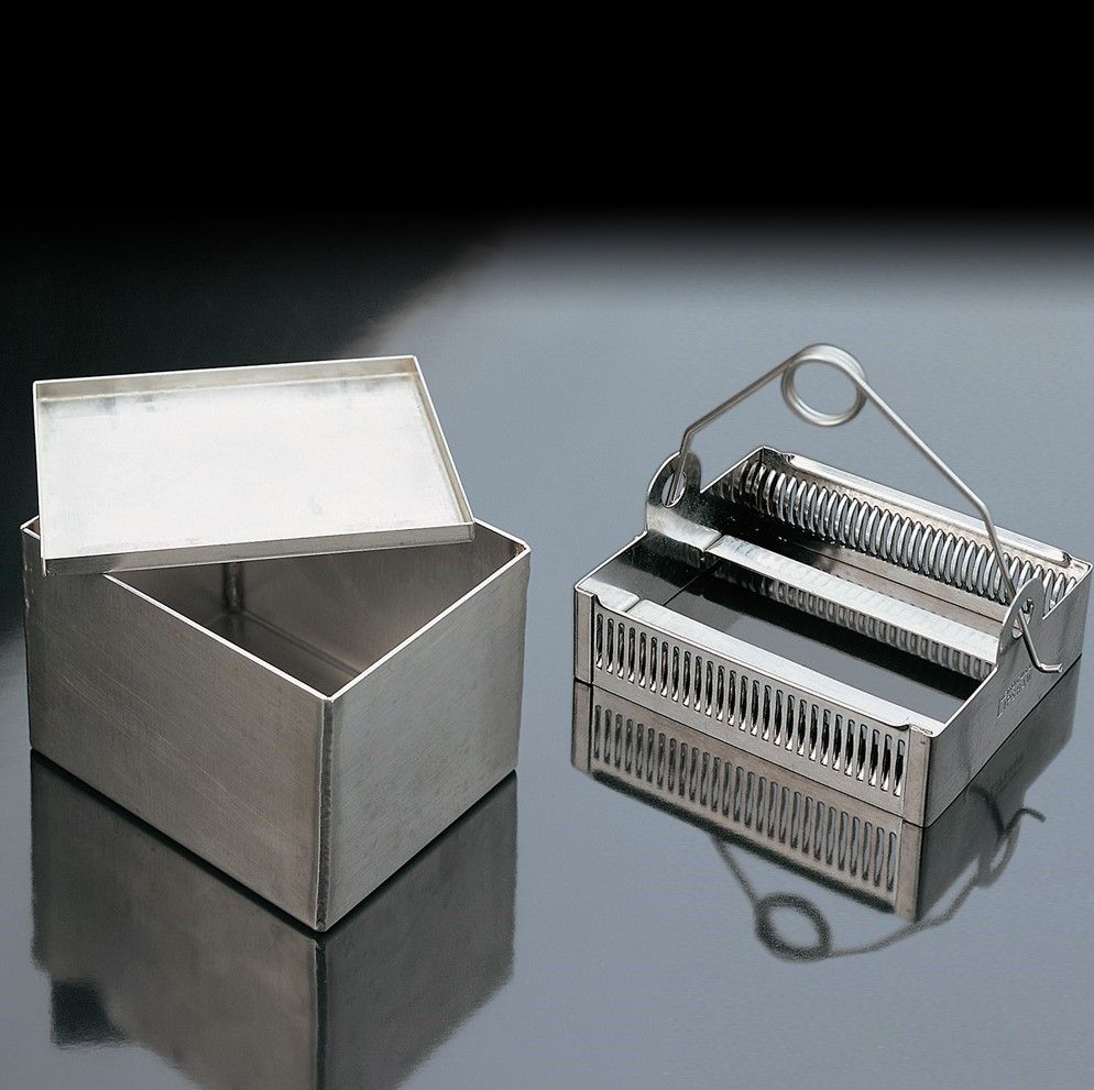 Autoclavable. With a lid to avoid evaporation. The staining basket is designed for 30 slides of 26x76 mm for use in the above staining jar, code 22.19360. Includes an adjustable handle for more convenience. Material: Stainless steel.