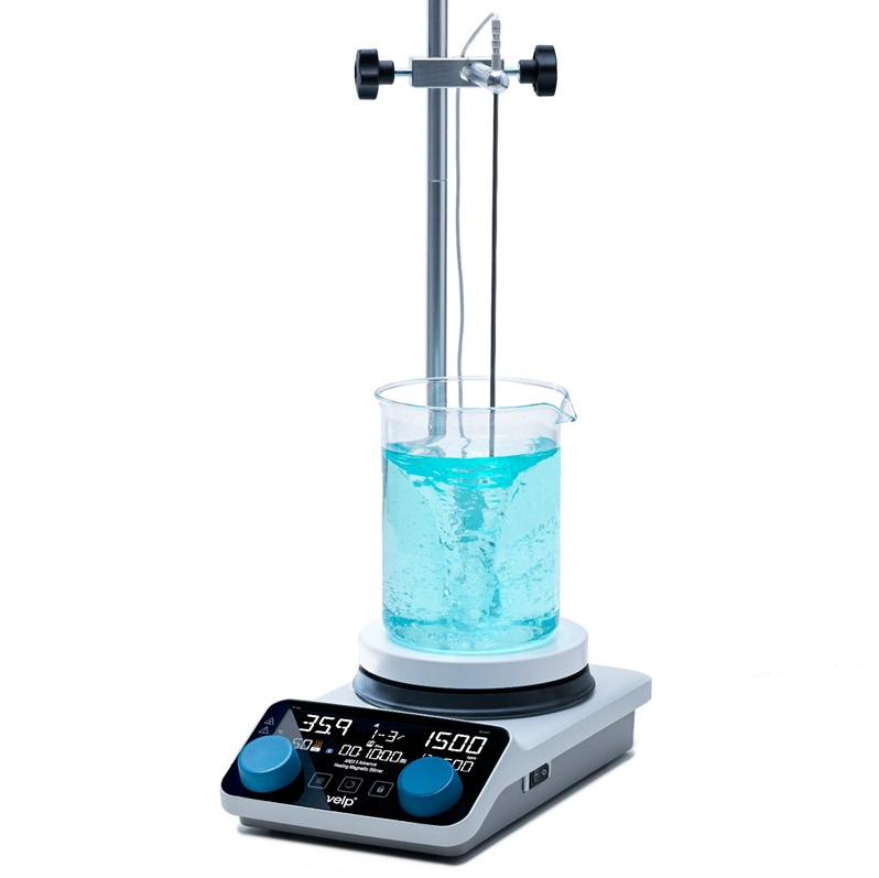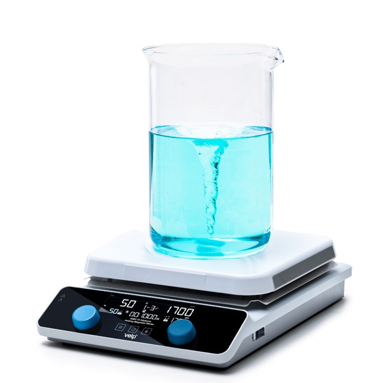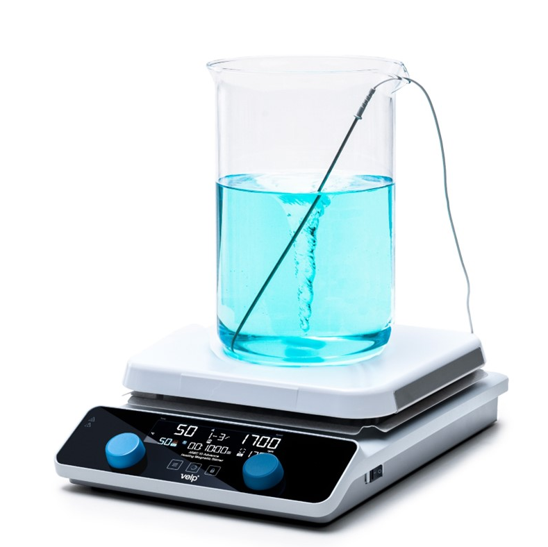 "Thanks to the Wi-Fi technology built into the device, its operation can be controlled from anywhere and at any time from the VELP Ermes platform. With timer, automatic reverse and CerAITop disc. Maximum protection. It consists of 2 independent safety circuits that turn off the heat, preventing possible dangers of overheating. When the plate temperature reaches 50°C, the display shows the hot sign. The probe's sensor alarm lets you know if the external probe is not immersed in the medium, thus preventing the sample from burning.