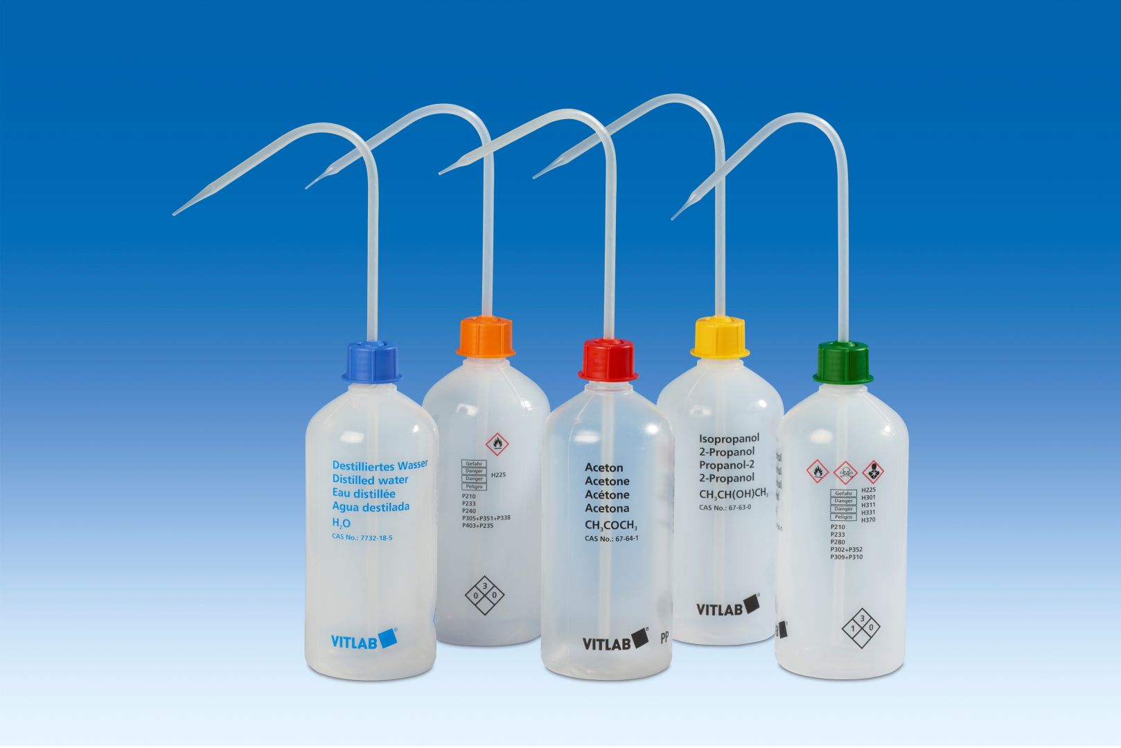 Made a combination of high and low density polyethylene. Transluscent bottle, with HDPE cap (blue), delivery tube and seal cap (natural). Bottle caps are ribbed for a better handling. High resistance to all liquids, acids and bases. Include a large neck for safe and easy filling. Mouth D=30 mm, base D=75 mm, H=185 mm.