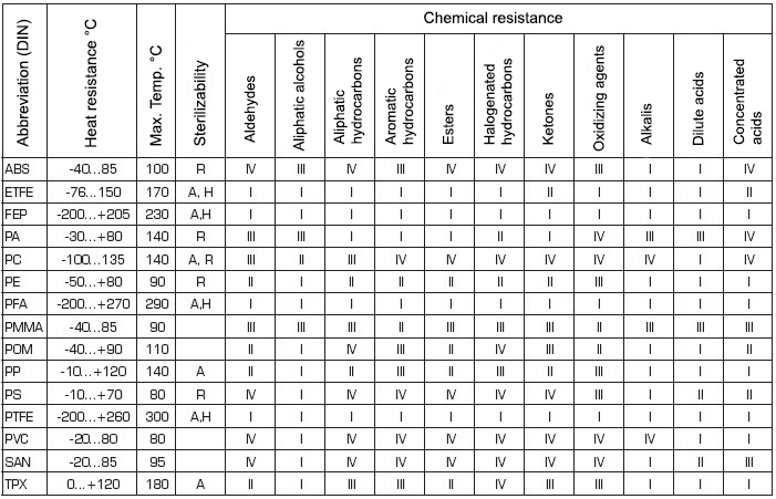 Other physical properties vary greatly. The conditions of use - exposure time and concentration of chemicals, temperature, possible sterilization, exposure to force, aging due to UV radiation, cleaning agents or other environmental influences - significantly determine which plastic is the most suitable for the given area of use.