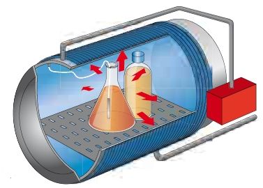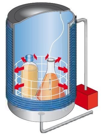 A sterilizált folyadékok lehűtését nem azok gyorsított párologtatásával érjük el, hanem a falak csapvízzel való hűtésével. Az autokláv kamrája köré kívülről szerelt hűtőspirálon keresztül a hűtés fázisában hűtővizet folyatunk át. A kamra így tejesen „üres” marad, semmi oda nem való dolog nem korlátozza a kamra terének kihasználását.