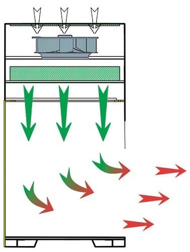 Vertikális légáramlás, csak a terméket védi.