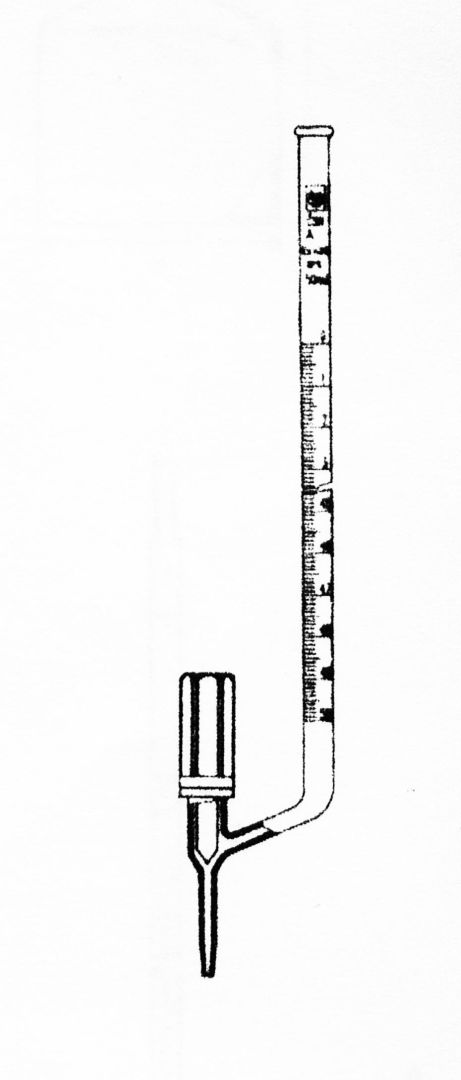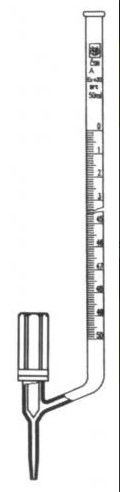 A jelzésű oldalcsapos büretta teflonszeleppel, Schellbach csíkkal ellátva.
