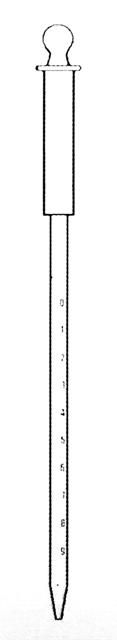 Osztott pipetta vagy mérőpipetta, kétjelű, A jelű. A két végjeles mérőpipetta többféle térfogatban kapható kék vagy barna színű beosztással.