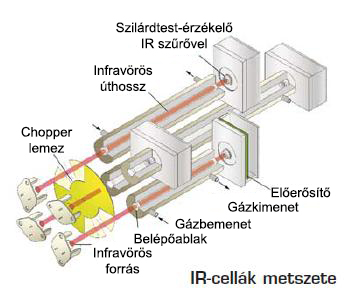 A gázok áthaladnak az összes mérőcsatornán, ahol az egyes anyagokra specifikusan érzékeny infravörös szenzorok érzékelik a minta összetevõit (CO2 és SO2), majd továbbítják ezt a jelet a feldolgozó egységnek.