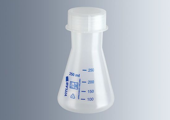 Anyaga: PP. 121°C-ig autoklávozható. Élelmiszeripari felhasználásra alkalmas. Dombornyomott osztással, 25 ml-ként. Nyakméret (DIN): 19/26.