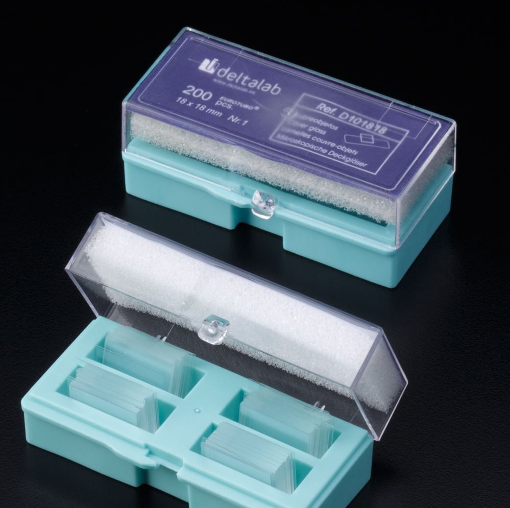 Fedőlemez 0,15 mm vastagságú üvegből, zárható dobozban, többféle méretben, mikroszkóp tárgylemezekhez.