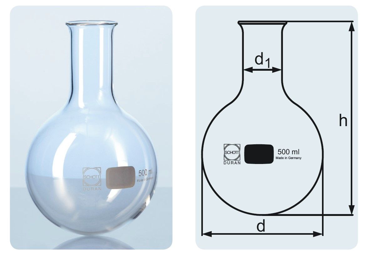 Szűknyakú gömblombik, hőálló boroszilikát 3.3 üvegből. Duran márka.