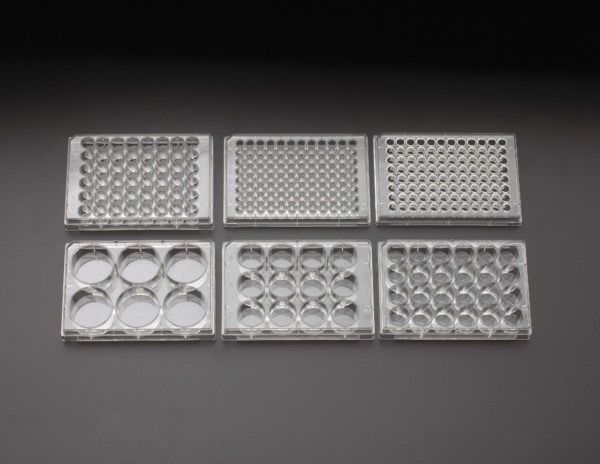 Polisztirol sejttenyésztő lemezek fedéllel, kezeletlen kivitelben. A tenyésztőlemezen a lyukak könnyen beazonosíthatók az alfanumerikus jelölésnek köszönhetően.