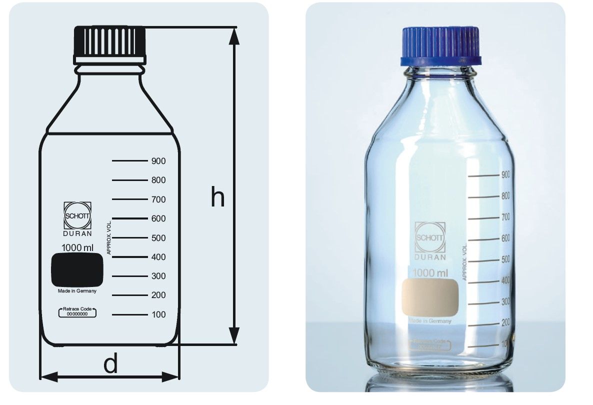 Méret: (d×h) 182 × 330 mm, Duran üvegből, kupak és kiöntőperem nélkül.Nyakméret: GL45