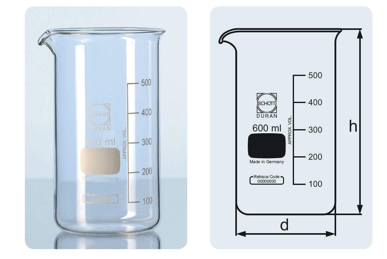 Magas formájú főzőpohár osztással, kiöntőnyílással többféle térfogatban. Hőálló boroszilikát 3.3 üvegből. Duran, Simax, Kimble /Rasotherm gyártmányok.