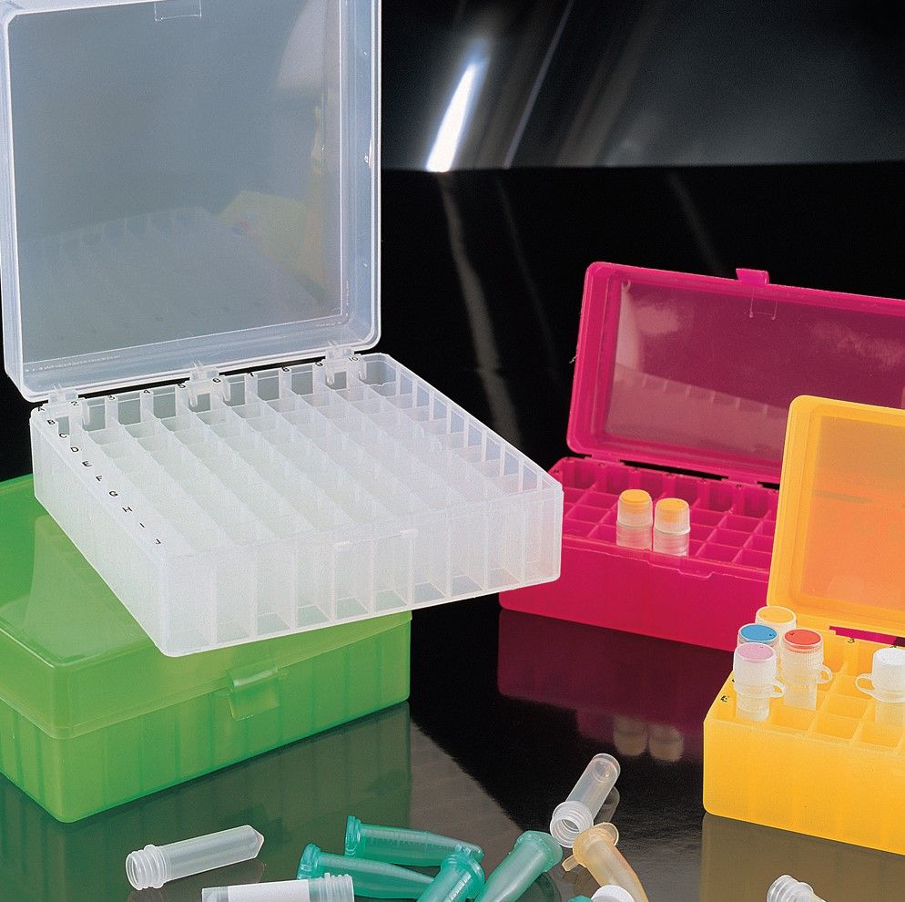 Fehér, natúr, sárga és zöld mikro- és kriocső tartódoboz levehető, átlátszó tetővel
