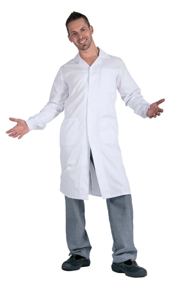 elől 3 zsebbel. Anyaga: 100% fehér pamut, 60°C-on kíméletes üzemmódban mosható, fehérítő szerrel kezelhető. Mérete: vállszélesség: 38 cm, mellbőség: 50 cm, ujja hossza: 60 cm, köpeny hossza: 108 cm. EU szabvány: EN340:2003.