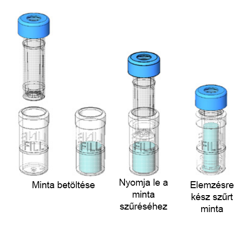 A minta a külső fiolába kerül, majd a belső betét lenyomásával áthalad a membránon. A szűrt, használatra kész minta a belső betétből könnyen és tisztán áthelyezhető a szeptum kupaknak köszönhetően.