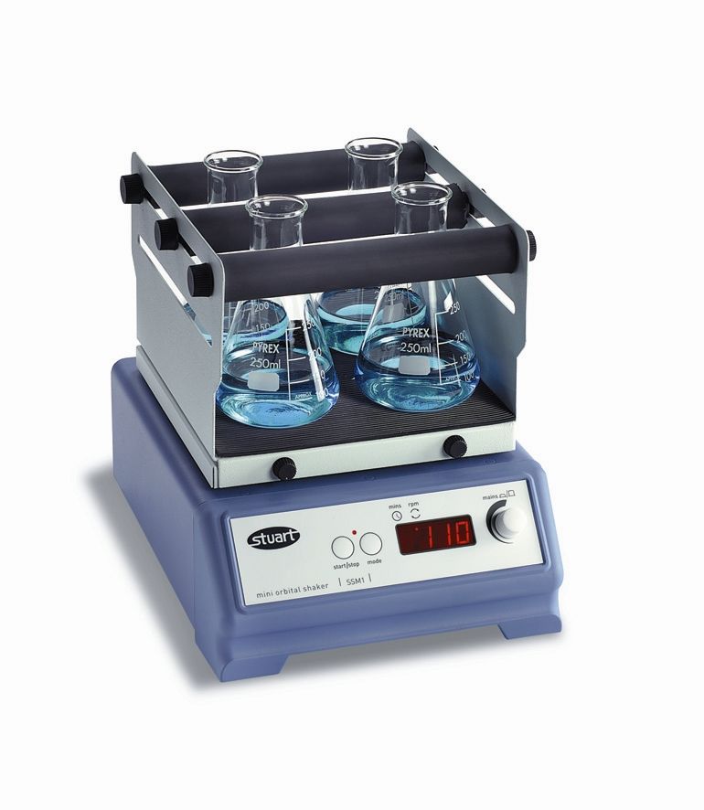Rögzítőrudas rázóasztal lombikokhoz, üvegekhez. A rögzítőrudak vízszintes és függőleges irányban is állíthatóak, így a kisebb lombikoktól a nagyobb üvegekig számos edény befogható, például.: 4 x 250 ml, 2 x 500 ml vagy 1 x 1.000 ml térfogatú erlenmeyer lombik. Mérete: 220 x 220 mm. Az SSM1 készülék illusztráció!