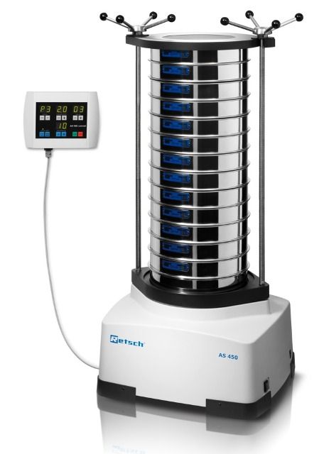 AS 450: nagy terhelhetőségű rázógép a RETSCH legnagyobb szitáinak (400 és 450 mm) háromdimenziós rázásához. A paraméterek beállítása egy külső kezelőegységen történik.