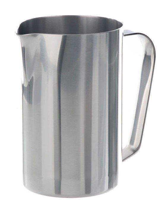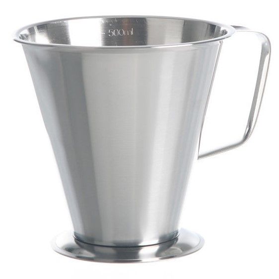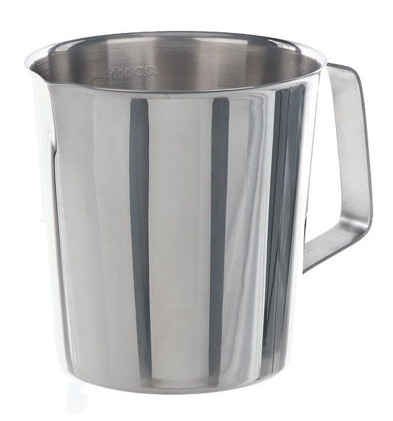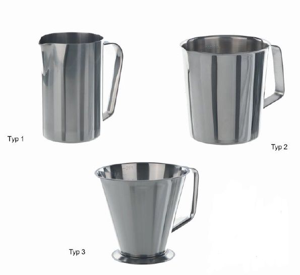Kiváló minőségű rozsdamentes acél mérőkancsók, 100 ml-enkénti beosztással, 500 ml-től 2.000 ml-ig terjedő térfogattal.