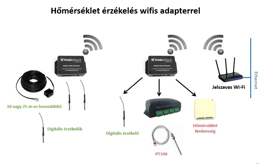 További részletekA szenzorok jelei továbbítására vezetékes illetve WiFi adatperek modul áll rendelkezésre. A megfigyelésre és riasztásra PC szoftver illetve egy internetes felület is rendelkezésre áll. Utóbbi demo/demo azonosító/jelszó párossal az alábbi linken érhető el: http://www.thermotrack-webserve.com/home/blog/login.php (A felület használatához Java engedélyezésére van szükség.). Az online rendszer szolgálatásai elérhetők egyszeri költség megfizetésével vagy éves előfizetéssel. Az E-mail illetve felugró ablakos riaztás mellett további opcióként SMS riasztás is rendelhető.