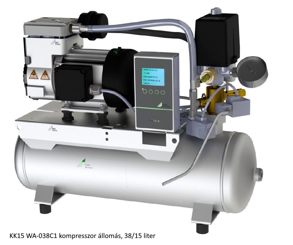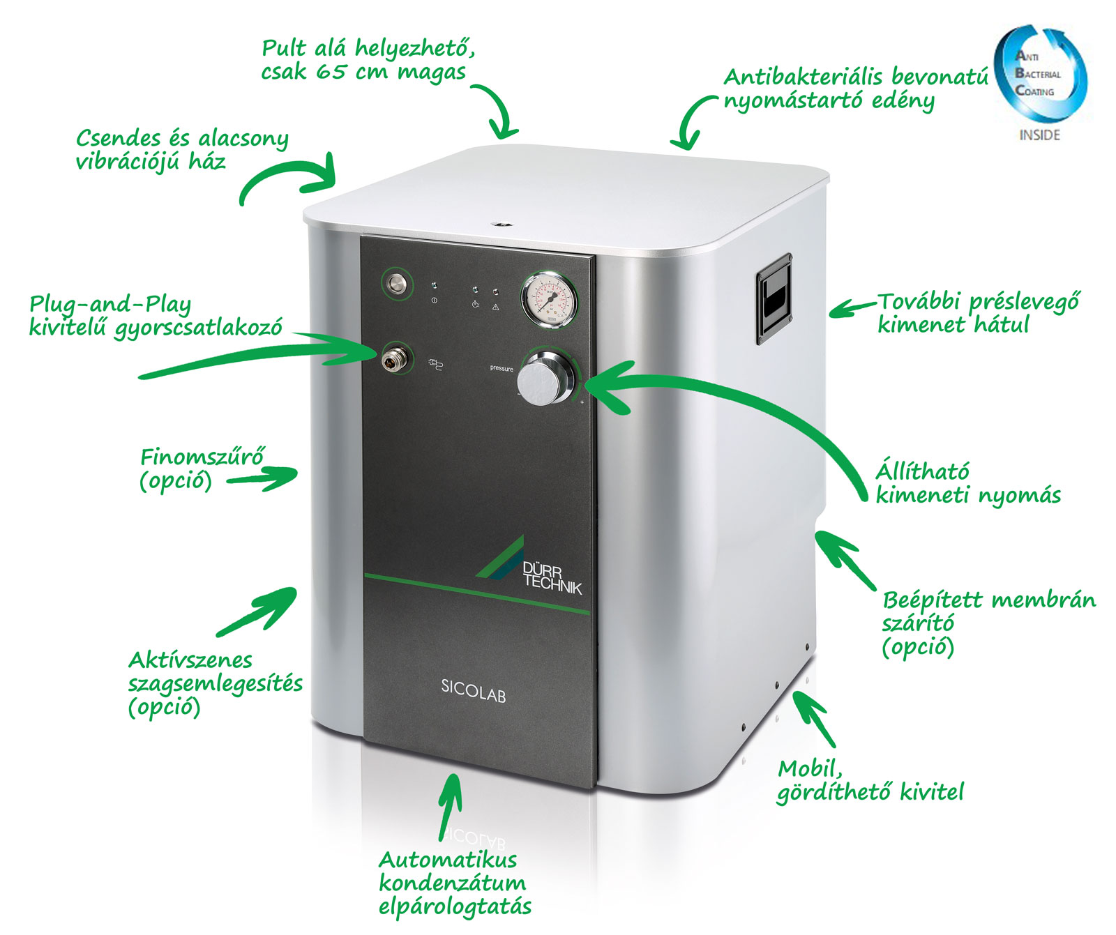 Modern kivitelű, pult alá elhelyezhető, ultra csendes olajmentes, alacsony vibrációjú központi kompresszor-állomás.