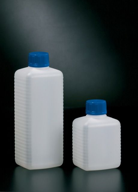 Szögletes edény 100 ml-enkénti beosztással, csavaros kupakkal, záróbetéttel. Anyaga: polietilén (PE).
