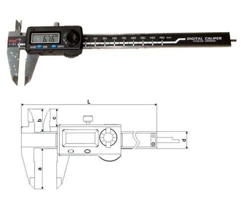 Méréstartomány: 0 - 150 mm, mérőpofák: 21/40 mm, normál, pontosság: ±0,02 mm Kijelzőjének karakterei 7 mm-esek, és a kezelőn 2 gomb van: ZERO, mm/inch. A használaton kívüli készülék 5,5 percen belül kikapcsol. Anyaga: edzett rozsdamentes acél. Méretek (mm): L=236, a=40, b=21, c=16,5, d=16